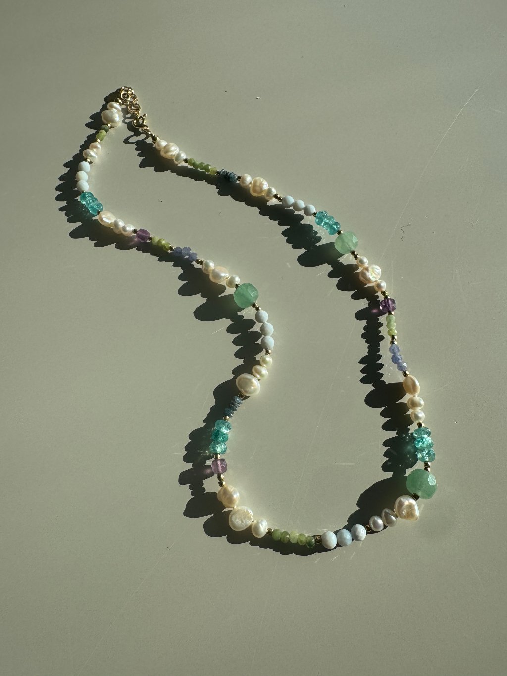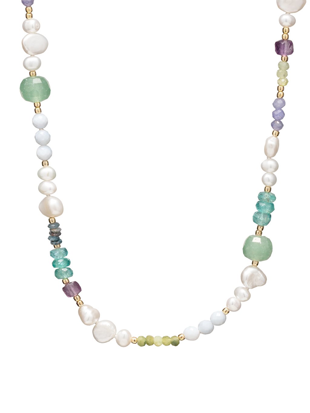 Příběh a popis šperkuNáhrdelník z perel a barevných drahých kamenů poskládaný jako malá sbírka tvarů a odstínů. Náhrdelník Iris je šperk inspirovaný radostí z barev a spontánností.