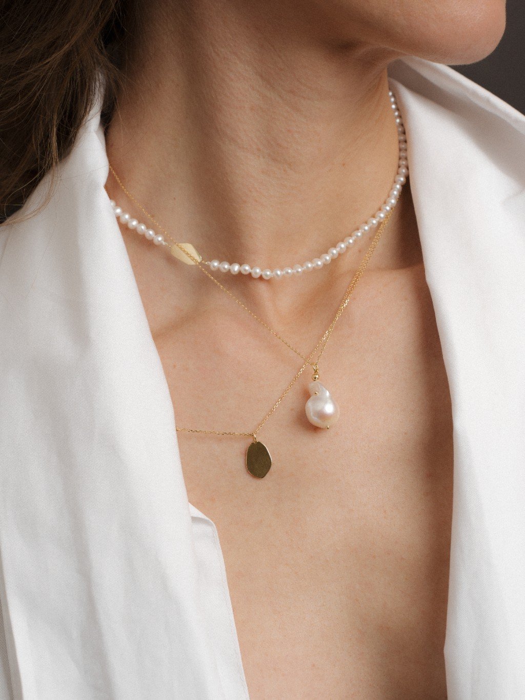 Příběh a popis šperkuNáhrdelník Unum je tvořen řadou jemných perel, které doplňuje jediný zlatý prvek inspirovaný tvarem barokní perly. Jeho organická silueta přináší do pravidelného rytmu perel přirozený kontrast a stává se nenápadným středem pozornosti.