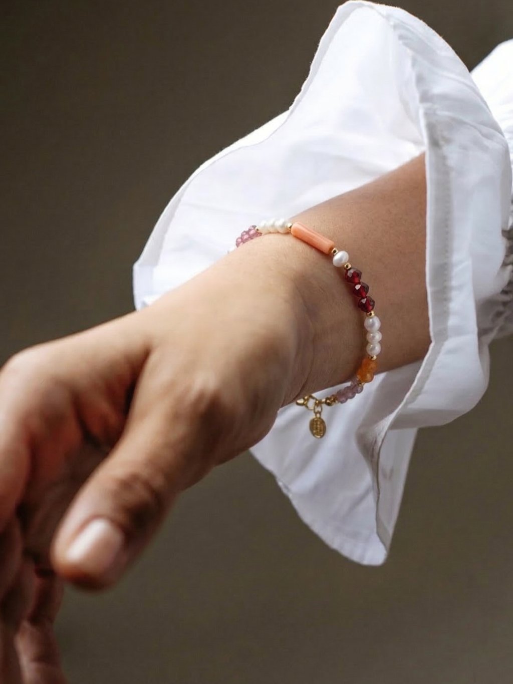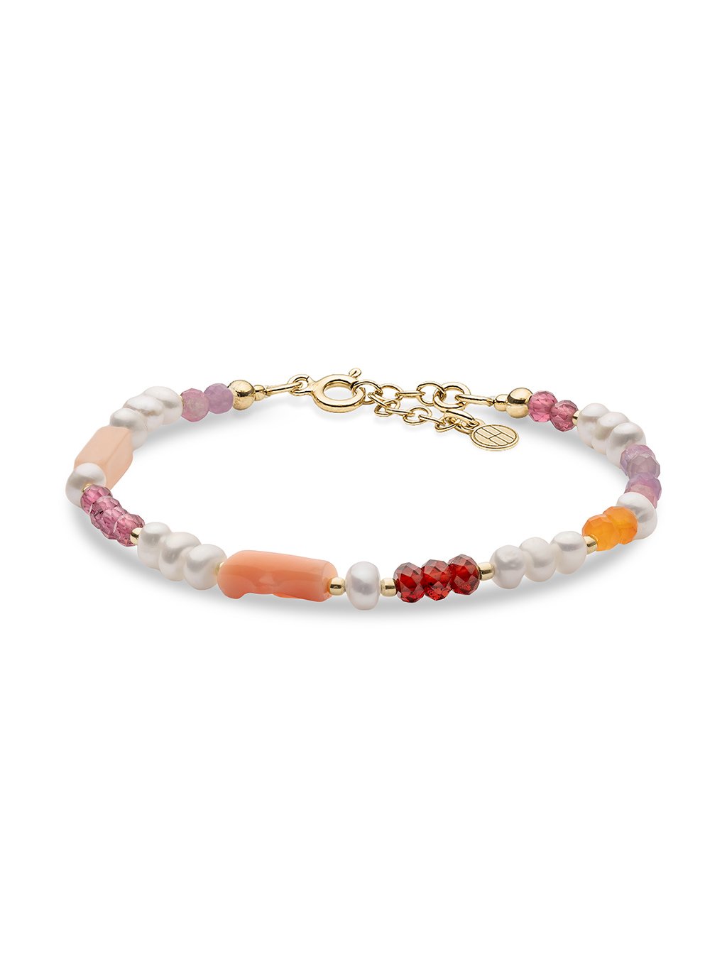 Příběh a popis šperkuNáramek z perel a barevných drahých kamenů poskládaný jako malá sbírka tvarů a odstínů. Náramek Camellia je šperk inspirovaný radostí z barev a spontánností.