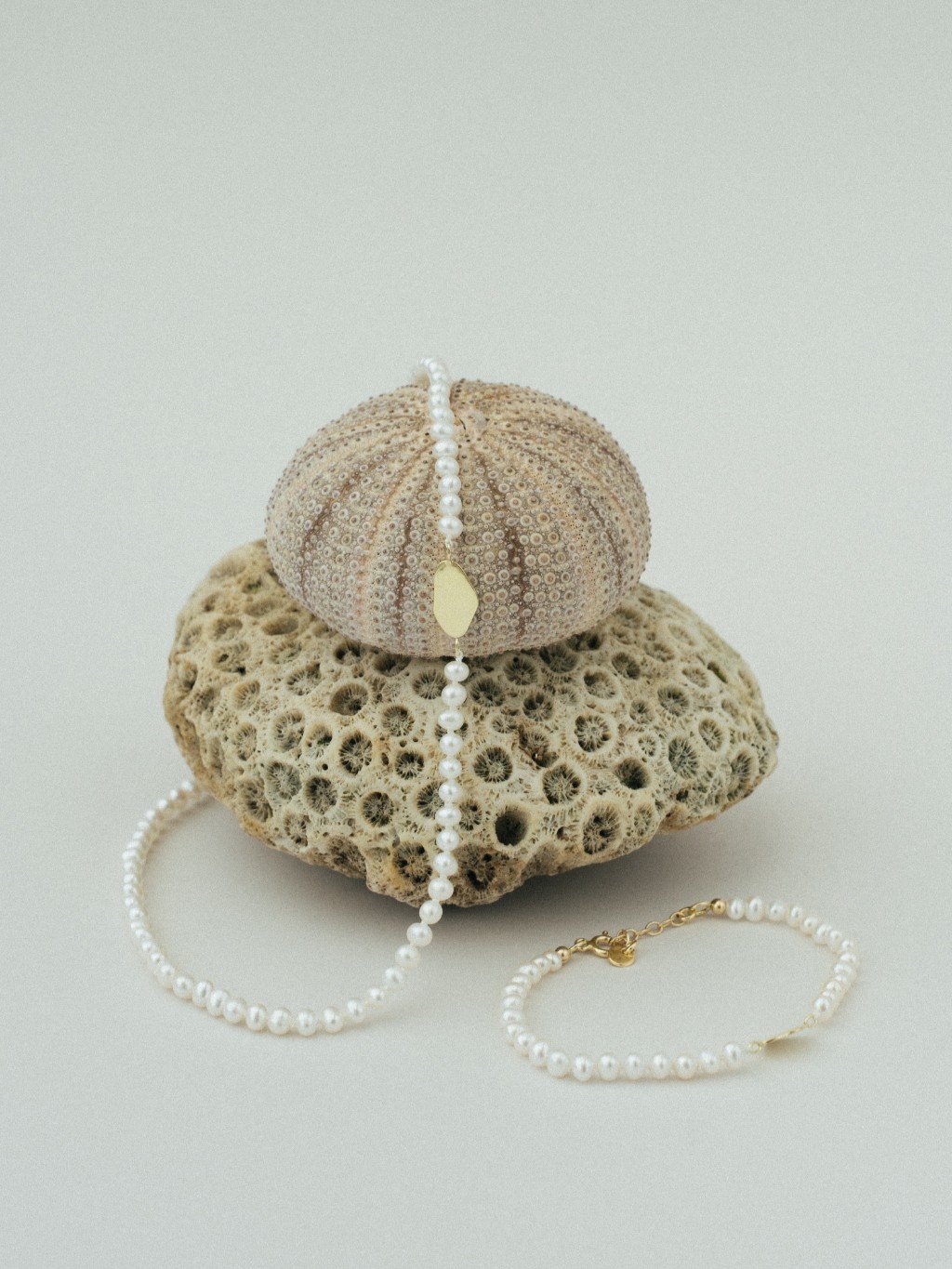 Příběh a popis šperkuNáramek Unum je tvořen řadou jemných perel, které doplňuje jediný zlatý prvek inspirovaný tvarem barokní perly. Jeho organická silueta přináší do pravidelného rytmu perel přirozený kontrast a stává se nenápadným středem pozornosti.