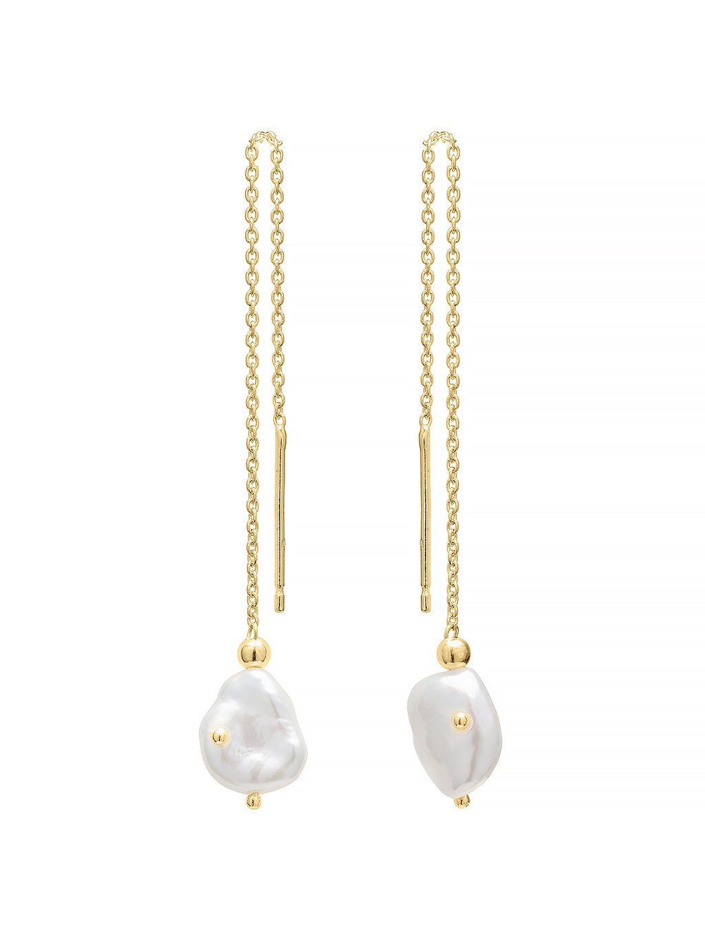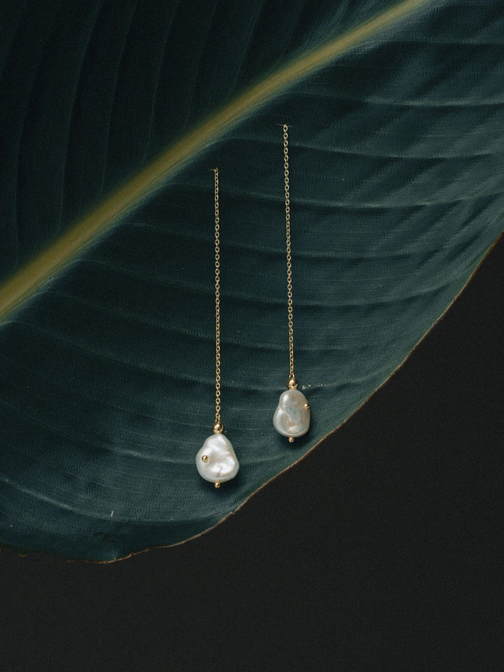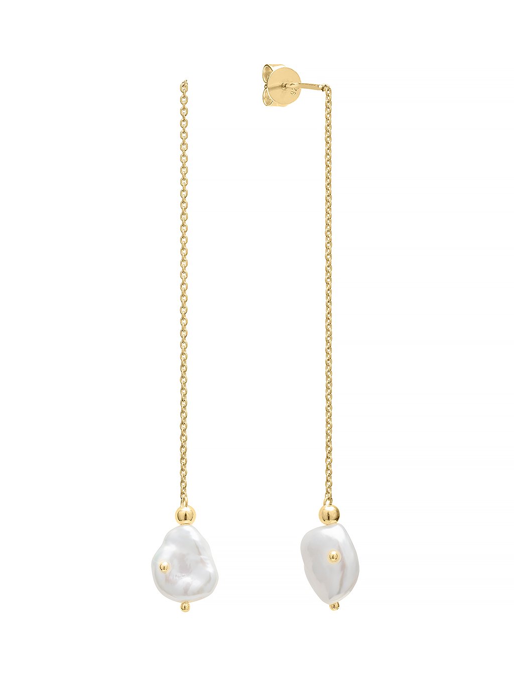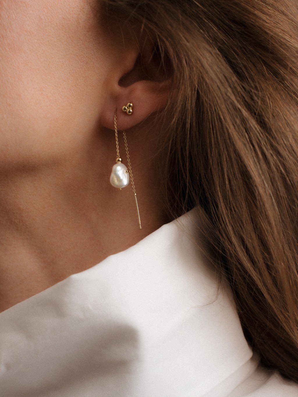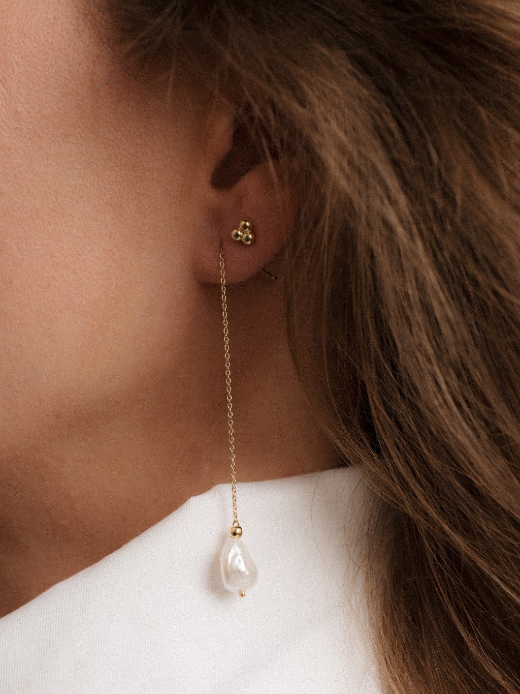 Příběh a popis šperkuŘetízkové náušnice Aura z keshi perel, jejichž přirozený tvar je doplněný drobnou zlatou granulací. Malý zlaté bod na jejich povrchu působí jako zachycený odlesk světla a podtrhuje jedinečnou kresbu každé perly.Náušnice můžete nosit vícero způsoby - buď použijete puzetové zapínání a necháte vyniknout celou jejich délku, nebo je provléknete ušní dírkou až do poloviny řetízku a užijete si ležérnější styl nošení.